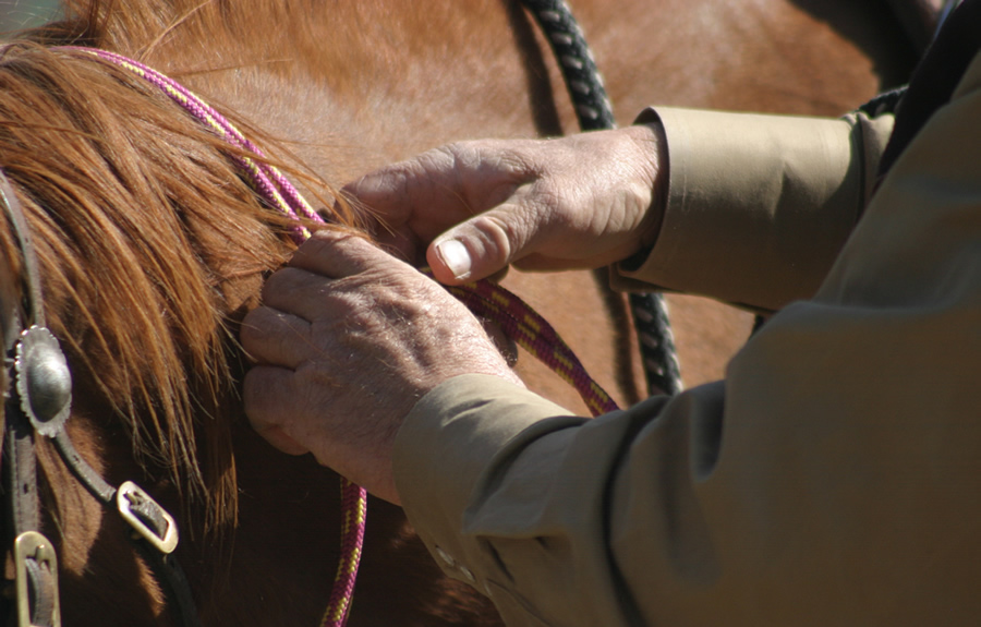 Tom had the fellow get the halter ready to come off and had him allow it to drop off the horse's head while he walked off holding the lead rope. Instead of letting the horse leave you — you leave the horse. He left the horse standing in his own tracks wondering where the cowboy was going.